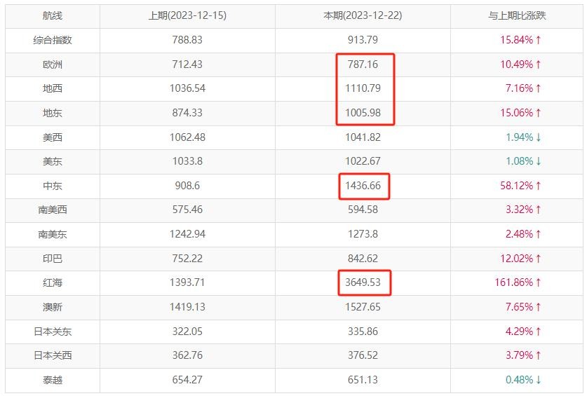 而据12月22日宁波航运交易所公布的本周海上丝绸之路指数来看,2024年1月后开航航次的海运运价,欧洲航线运价指数为787.16点,较上周上涨10.49%;地东航线运价指数为1005.98点,较上周上涨15.06%;地西航线运价指数为1110.79点,较上周上涨7.16%。此外,中东航线本周运价指数报1436.66点,较上周上涨58.12%。